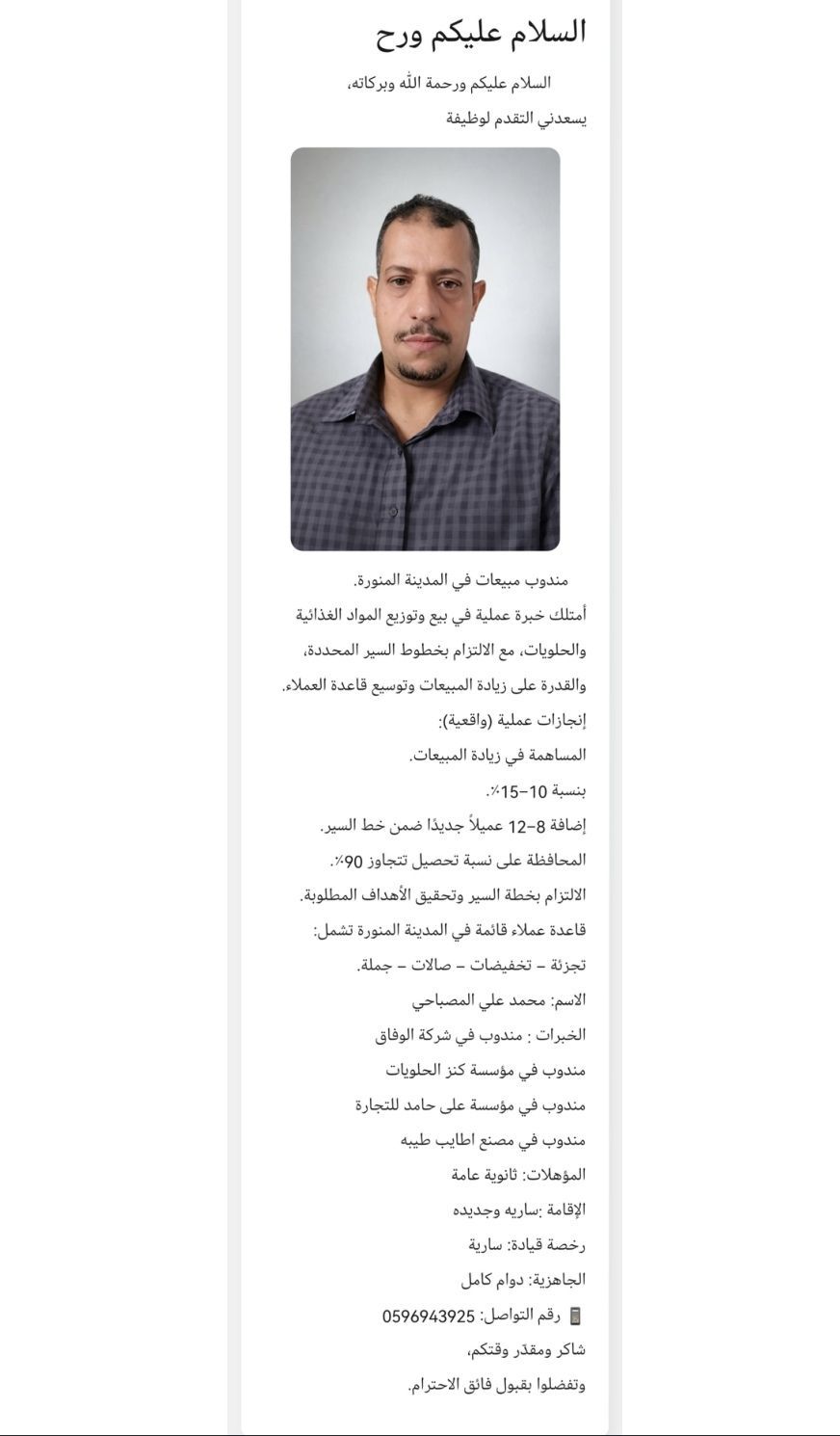 مندوب مبيعات محترف وعندي قاعدة عملاء واقعين تجزئة تخفيضات وصالات وجملة وعندي التزام بخطوط السير والجديه والالتزام في العمل