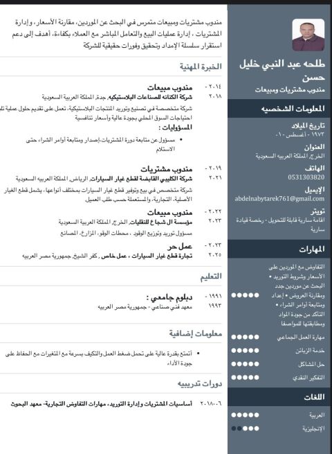 مندوب مبيعات ذو خبرة قوية في مجال البيع والشراء وإدارة العملاء، امتلك مهارات عالية في تحقيق أهداف المبيعات وزيادة الايرادات بناء علاقات طويلة الأمد مع العملاء التفاوض والاقناع واغلاق الصفقات إدارة المناطق البيعية ومتابعة التحصيل العمل الميداني وتحمل ضغط العمل عملت كمندوب مبيعات لسنوات، اضافة الى خبرة عملية في إدارة متجر (بقالة) لمدة 5 سنوات، مما عزز لدي فهم السوق واحتياجات العملاء