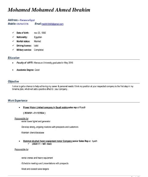 ابحث عن عمل ولدي خبرة في المبيعات وأجيد قيادة السيارات كما هو موضح بال CV