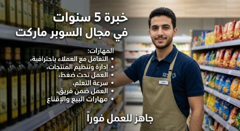 أنا شاب مصري مقيم في الرياض - حي الملقا، بدور على فرصة شغل في سوبر ماركت أو هايبر ماركت. عندي خبرة أكثر من 5 سنين في المجال. ملتزم في الشغل، وبتحمل ضغط العمل، واسعي دايما أطور من نفسي وأكون اضافة لأي مكان اشتغل فيه