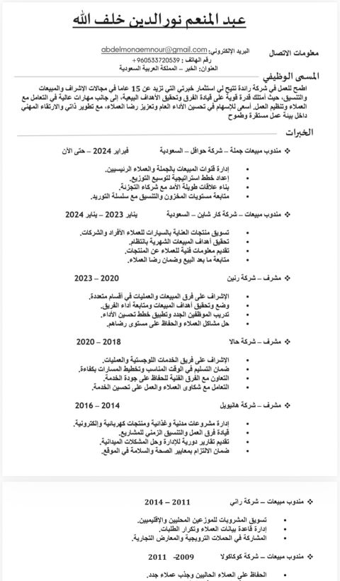 مقيم في الرياض إقامة ورخصة سارية اشتغلت بالمبيعات بالاعلانات مندوب ثم مشرف مبيعات واشتغلت بمبيعات مشاريع الأمن والسلامة وعلي دراية في الرياض وأستطيع العمل بأي مجال بالمبيعات أتحمل ضغط العمل والعمل بروح الفريق لتحقيق الأهداف المطلوبه. المؤهل العلمي حاصل على ليسانس الحقوق