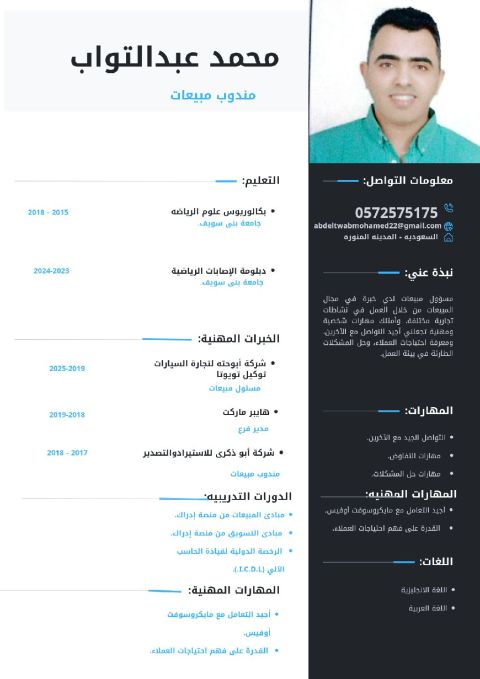 باحث عن وظيفة مندوب مبيعات، عملت 4 سنين في المملكة في شركة Nestle، أتميز بخبرة في التواصل الفعال مع العملاء، وفهم احتياجاتهم لتقديم أفضل الحلول والخدمات، القدرة علي تحقيق الأهداف البيعية، وبناء علاقات قوية وطويله الامد مع العملاء. اسعي دائما لتطوير مهاراتي والمساهمه في نجاح الفريق والشركة