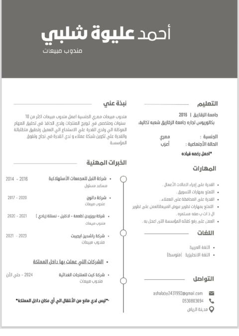 مندوب مبيعات وتسويق متميز بخبرة ق تزيد عن سبع سنوات في صناعة التسويق لدي خبرة واسعه في تطوير وتنفيذ الاستراتيجيات التسوقية المبتكره التي تحقق النتائج الايجابيه ملم بأحدث التقنيات الرقميه والابداعيه في المجال. أملك رخصة قيادة سارية المفعول