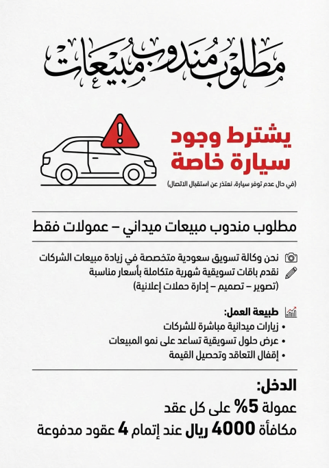 فرصة عمل ممثل مبيعات المدينة حي الملك فهد فرصة عمل ممثل مبيعات (عمولة + مكافآت) عمل ميداني يشمل زيارة جميع أنواع الشركات، وعرض خدماتنا في التسويق والاعلان بنظام مالي مرن يكافئ اجتهادك الحقيقي. الدخل 5% عمولة من كل عقد بعد التحصيل. 4000 ريال مكافأة عند تحقيق 4 عقود محصلة. 2% زيادة على أي عقد بعد العقد الرابع. المكافأة مرتبطة بتحقيق 4 عقود فقط وليس بتاريخ الشهر. في حال تأخر اكمال الهدف لبضعة