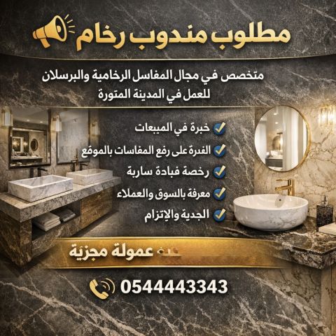 مطلوب مندوب مبيعات متخصص في الأعمال الرخامية خبرة لا تقل عن 5 سنوات في نفس المجال للعمل في المدينة المنورة شارع الملك عبدالعزيز حي الفتح عمولة مجزيه يشترط توفر سيارة والالمام بشوارع المدينة المنورة