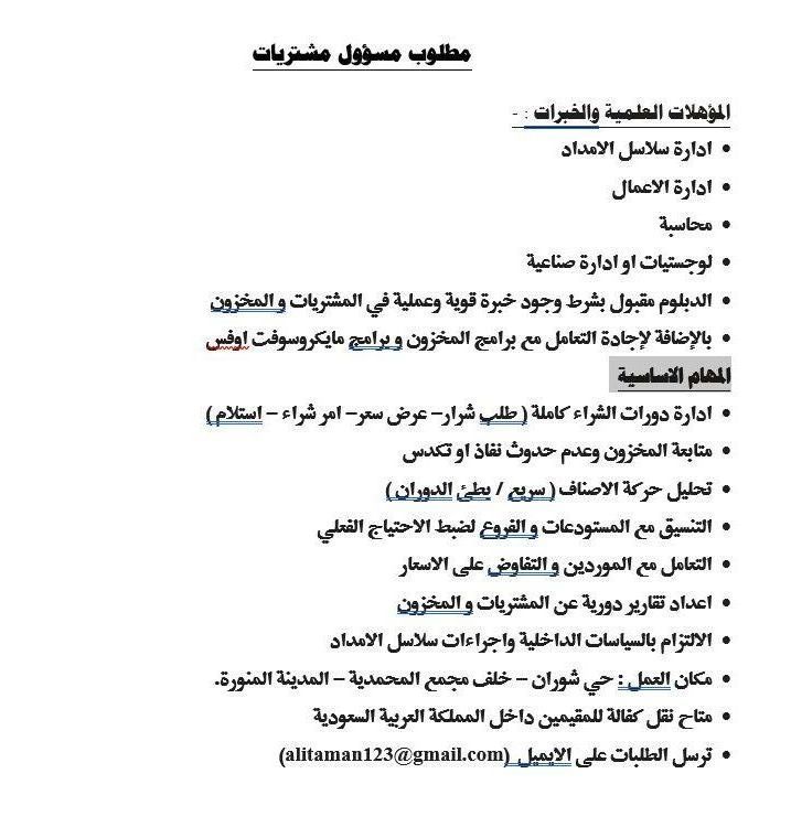 فرصة وظيفية في المدينة المنورة - شوارن حي السد - العمل كمسؤول مشتريات