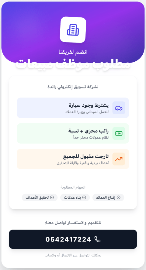 تعلن شركتنا عن توفر شواغر وظيفية للانضمام الى فريق العمل مطلوب مناديب ومشرفين مبيعات المقر الرئيسي في المدينة المنورة على أن يكون العمل في مدن جدة - مكة المكرمة - حائل - القصيم بجميع الأحياء بالتوزيع الشروط خبرة الزامية في مجال الخضار المجمد - والتمور - جملة لا يقبل أي خبرة خارج هذا المجال نهائيا القدرة على تحقيق الأهداف والانتشار في السوق مهارات تواصل ممتازة ارسال السيرة