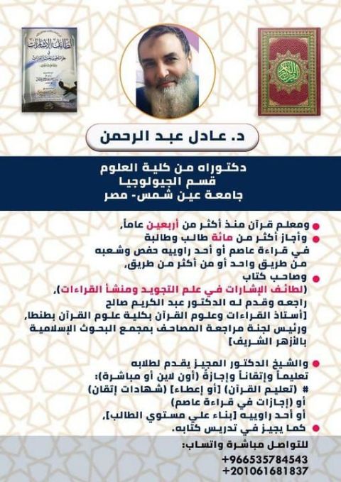 ما يقدمه الشيخ الدكتور المجيز لطلابه من أهل القرآن 1 - تحسين مستوى القارئ) بقدر اجتهاده من خلال سماع ختمة كاملة منه يتم فيها تصحيح تلاوته علي أن لا يقل مستواة ابتداء عن 70%. 2 - اعطاء شهادة اتقان) لمن مستواة في القراءة أكثر من 90%. 3 - اعطاء إجازة) في قراءة عاصم أو أحد راوييه حفص أو شعبة من طريق الشاطبية أو من أحد طرق طيبة النشر، لمن مستواة لا يقل عن 99%