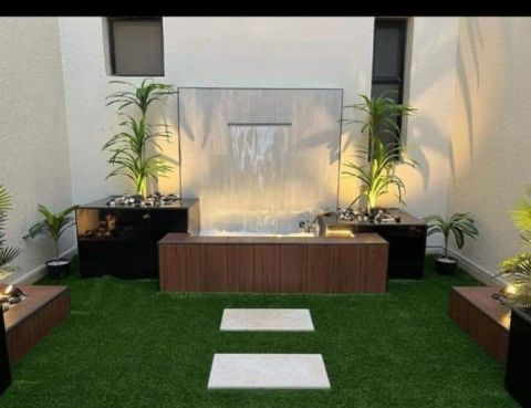 المدينة المنورة مؤسسة لاند سكيب البيت العصري لتنسيق الحدائق تصميم غرف زجاج جلسات ومظلات أحواض زرع مع الاضاءة شبكات ري كل أعمال الديكور