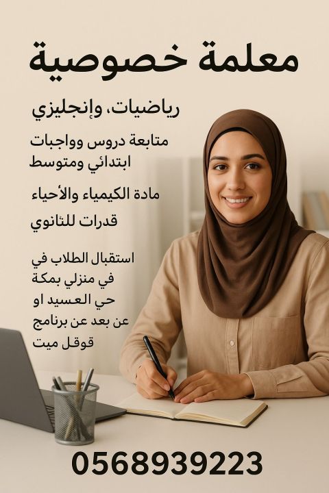 معلمه خصوصيه سودانية أدرس علوم ورياضيات وانجليزية ابتدائي ومتوسط وأحياء وكيمياء وقدرات ثانوي حضوري في مكة أو عن بعد