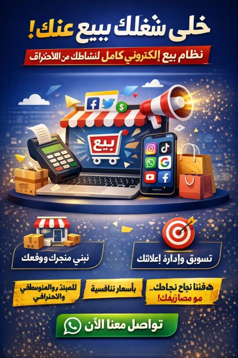 هل عندك متجر اونلاين أو نشاط تجاري وعايز مبيعات حقيقية نوفر لك نظام الكتروني بيعي متكامل يبدأ من انشاء الموقع أو المتجر، تجهيز المنصات، صناعة المحتوى، وإدارة التسويق والاعلانات، لحد تنظيم الطلبات والمتابعة. نشتغل مع المبتدئ والمتوسط والاحترافي بأسعار مرنة حسب حجم النشاط. اللي بتدفعه فقط تكلفة الاعلانات والمنصات، وأتعابنا حسب الاتفاق. هدفنا نشاطك يبيع ويكبر بشكل