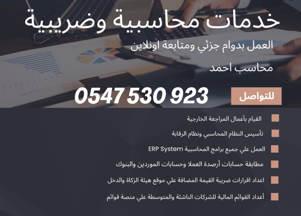 محاسب عام - خبرة بأعمال مراجعة الحسابات وأنظمة الرقابة، العمل علي جميع البرامج المحاسبية، تأسيس النظام المحاسبي للشركات والمؤسسات، خبرة بالحسابات العامة والحسابات الختامية والضريبية، مطابقة حسابات أرصدة العملا وحسابات الموردين والبنوك، واعداد اقرار ضريبة القيمة المضافة ورفعها علي موقع الزكاة والدخل، اعداد القوائم المالية للشركات الناشئة والمتوسطة ورفعها علي منصة قوائم العمل بدوام جزئي ومتابعة