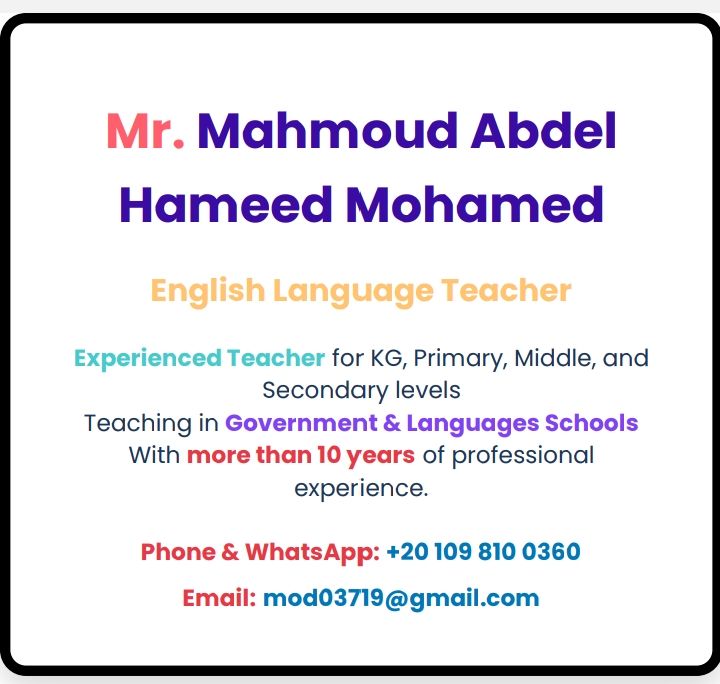 مستر محمود عبد الحميد محمد مدرس لغة انجليزية لكل المراحل التعليمية من رياض الاطفال وابتدائي ومتوسط وثانوي مناهج حكومي ولغات ومنهج STEP وقدرات لفظي خبرة أكثر من عشر سنوات في تعليم اللغة الانجليزية وعندي خبرة في مجال الكمبيوتر