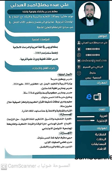 الاسم. أحمد راضي ممدوح الجنسية. مصري مقيم في الرياض. إقامة سارية سنة مهنية قابلة للنقل حاصل علي بكالوريوس خدمة اجتماعيه ابحث عن وظيفة معلم صعوبات تعلم وتنمية مهارات ولدي خبرة كمعلم شادوا. ولدي خبرة كموجه طلابي. ولدي خبرة مقدم رعاية ابحث عن عمل في كل من الآتي. كاشير. أو موظف استقبال. وايتر. أمين مستودع مدخل بيانات. مراقب عمال