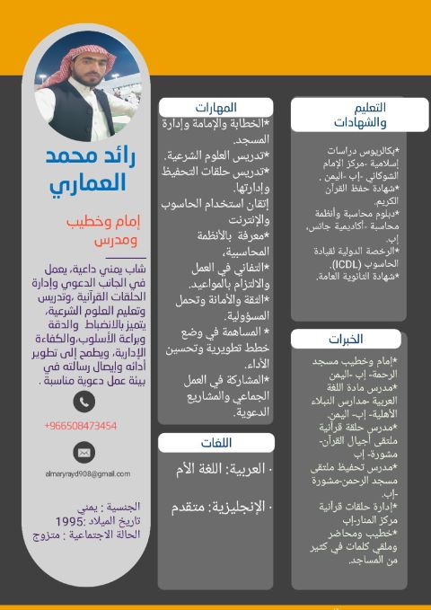 الشيخ أبو مصعب يمني الجنسية موجود في السعودية ومستعد للعمل في أي مكان في السعودية حيث وأنا إمام وخطيب وخريج دار الصحابة للقران الكريم والعلوم الشرعيه ومعلم للقران الكريم باحكام التلاوة والتجويد، صاحب صوت حسن وأداء متميز