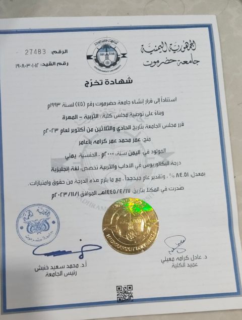 عمر محمد باعامر مدرس لغة انجليزية متمكن من اللغة الانجليزية لدي خبرة سنتين في مجال التعليم والتدريس ولقدرة على تطوير مستوى الطلاب والطالبات في جميع مهارات اللغة الانجليزية والتحدث بطلاقة ابحث عن عمل مدرس لغة انجليزية أو أي يعمل يطلب اللغة الانجليزية