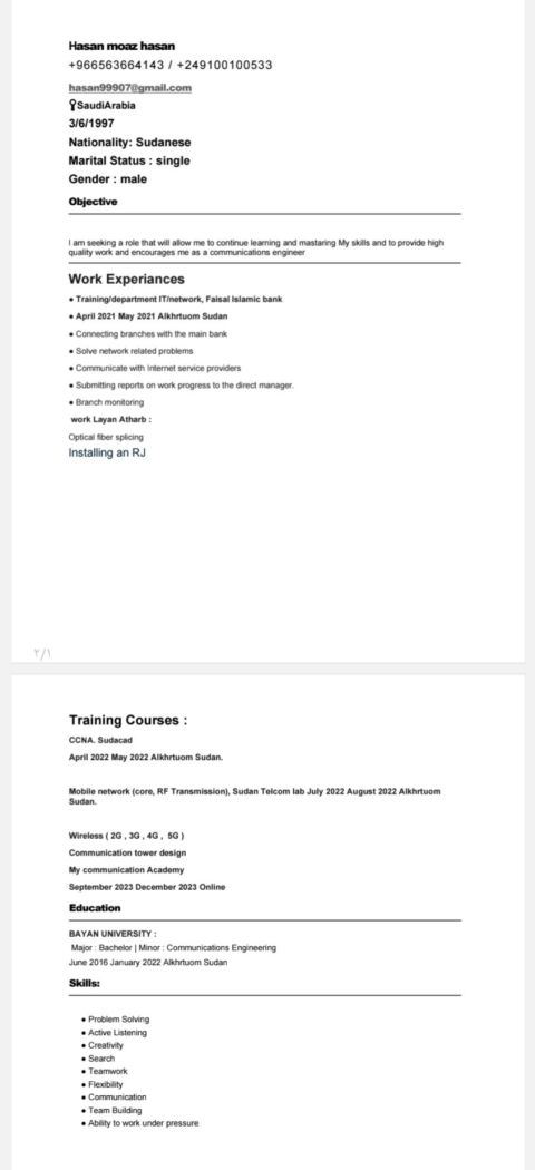 خريج هندسة الاتصالات سوداني مقيم في السعودية لدي رخصة وإقامة 26 سنة ابحث عن فرصة تدريب أو عمل في مجالات الاتصالات أو مدخل بيانات أجيد التعامل مع جهاز لحام الفايبر