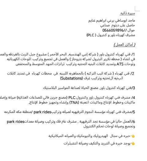 A highly skilled professional with over 10 years of technical experience in the electrical field and more than 8 years in control and equipment maintenance. Proficient in reading schematics, installing and maintaining various residential and Industrial electrical and electronic systems and devices, including renewable energy equipment. Skilled in installing, operating, and maintaining Industrial m