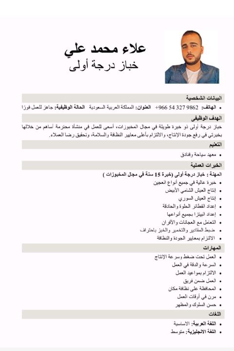 خباز درجة أولى أي حاجة فيها عجين بعون الله قادر عليها بيتزا بأنواعه فطائر حلو وحادق خبز أبيض شامي حاجة خبرة 20 سنة والله المستعان