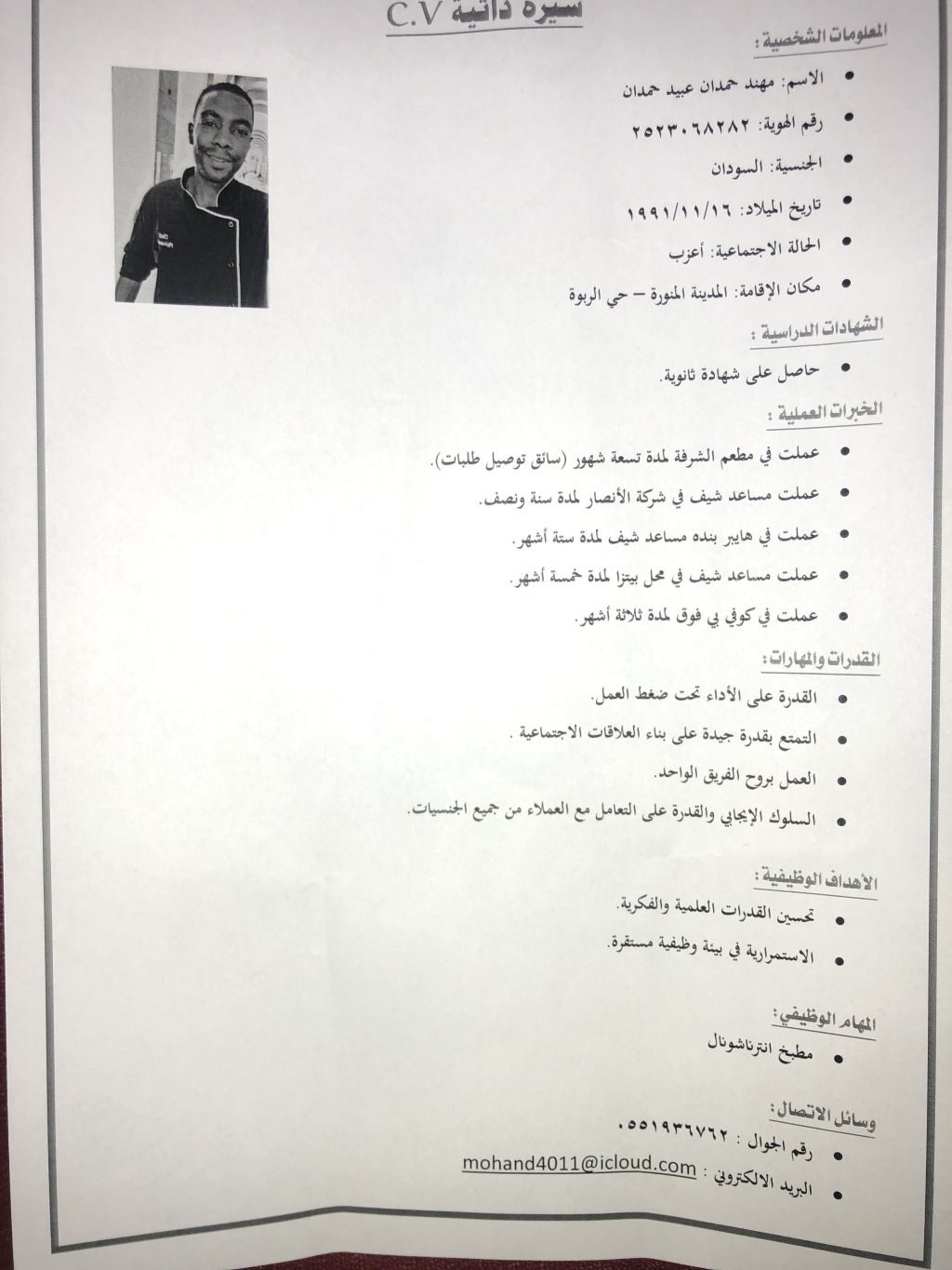 الاسم مهند حمدان عبيد حمدان مواليد المدينة المنورة عملت في مطعم الشرفة في الرياض سائق توصيل طلبات وعملت مساعد شيف حلواني في شركة الانصار لمدة سنة ونصف وعملت في هايبر بنده مساعد شيف خباز لمدة ستة أشهر وعملت في محل بيتزا لمدة خمسة أشهر وعملت في كوفي بي فوق مساعد شيف لمدة ثلاثة أشهر وعملت في فندق سجى المدينة مساعد شيف حلواني لمدة ثلاثة أشهر الهام الوظيفي مطبخ أنترناشيونال