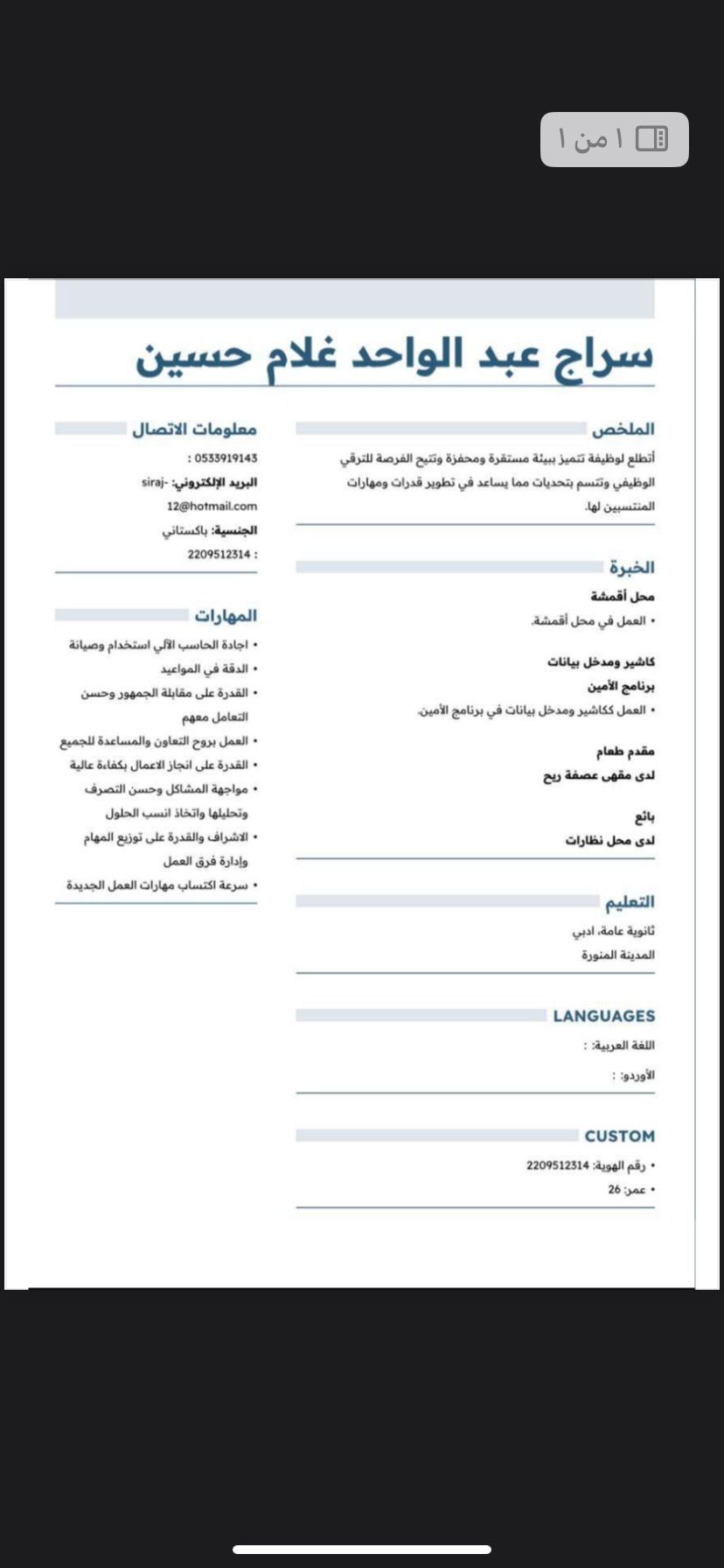 ابحث عن فرصة عمل اشتغلت كاشير اشتغلت مقدم طعام وايتر اشتغلت سائق لدى شركة اشتغلت مدخل بيانات مستعد ل أي عمل في المدينة المنورة