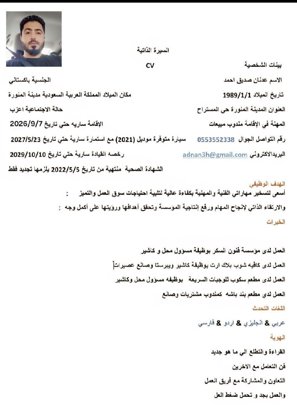 شاب باكستاني موليد المدينة المنورة حسن السيرة والسلوك والمظهر لدي أربعه لغات وعدة خبرات سابقه كاشير ومسؤول محل وعصير كوفي ابحث عن عمل في أي مجال إقامة سارية ولدي ورخصة قيادة وسيارة خاصه وشهادة صحيه يلزمها تجديد السيفي يضهر في الصورة وأسال الله التوفيق تواصل واتساب أو اتصال في أي وقت