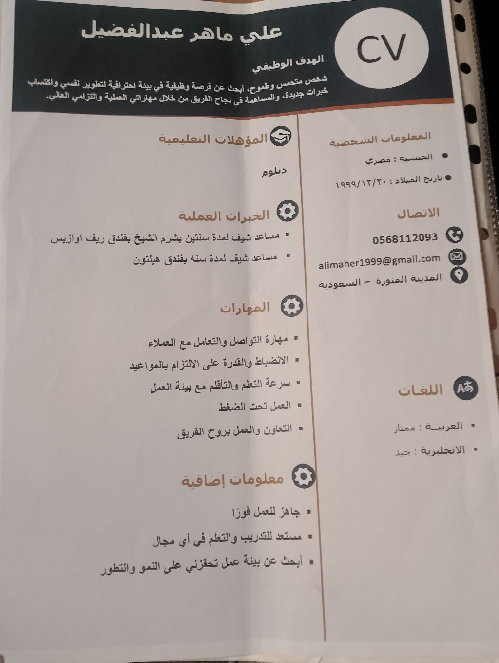 مساعد شيف كنت اعمل بفنادق مطعم ولدي شهادات خبرة بسنتين والإقامة سارية جاهز للعمل على الفور
