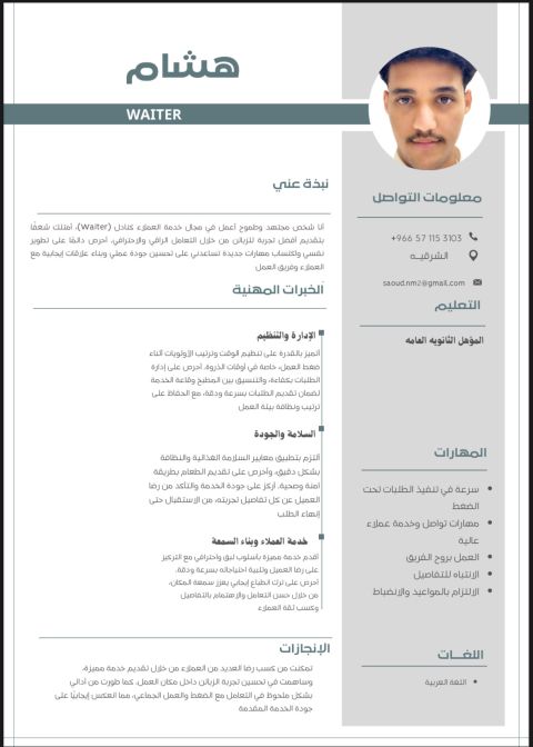 محاسب كاشير مدير مطعم الجنسية مصري خبرة في ادارة المطاعم سنتين / العمر 28 سنة/ مشرف عمال / موظف استقبال / أمين مخازن. متواجد في تبوك