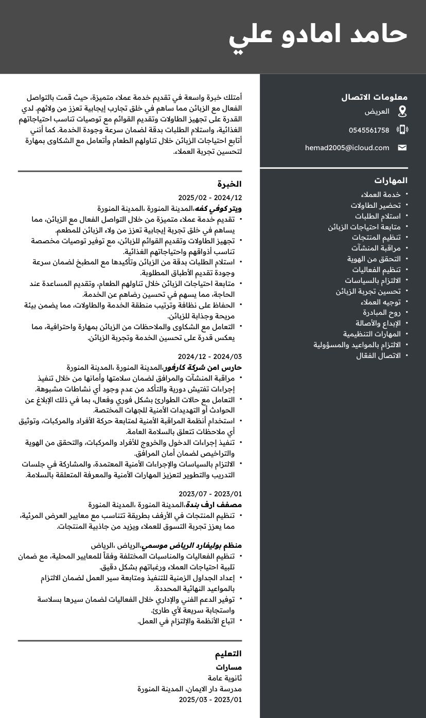 خريج ثانوية عامة 2025 ابحث عن فرصة عمل مجتهد ومنتظم في العمل أتعلم بسرعة محب لمجال المطاعم والكافيهات