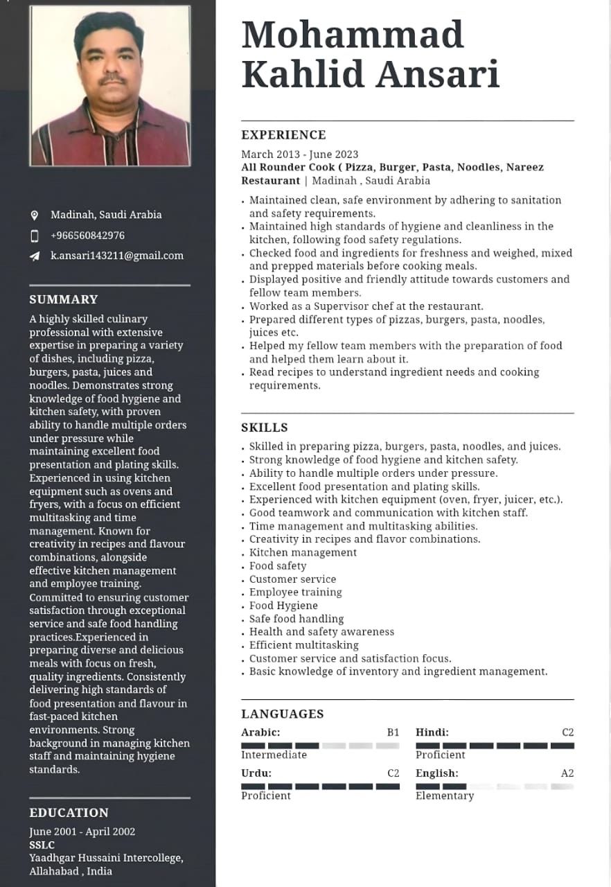 Experienced pizza, burger, pasta, noodles and juice maker with 8 + years of experience. Looking for a job to contribute my experiences