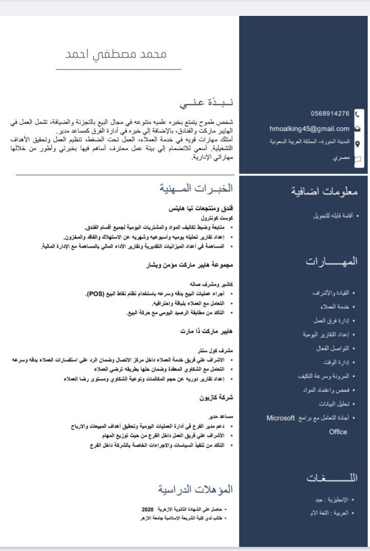ابحث عن عمل كاشير أو وايتر أو بائع في محل لدي خبرة كبيرة في تلك المجالات الاسم محمد مصطفى السن 23 الإقامة مهنية الجنسية مصري