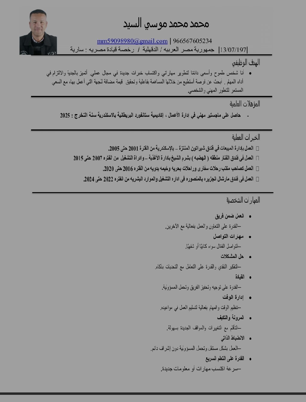 أطلب العمل في فندق قسم الاستقبال لدى الخبرة على مدار 20 عام في مجال الفنادق في الاسكندرية ادارة المبيعات والعمل في شرم الشيخ بإدارة الأغذية والمشروبات وإدارة التشغيل فندق الفنار والعمل صاحب مكتب رحلات سفاري ورحلات بحرية وخيمة بدويه والعمل بفندق مارشال الجزيرة بإدارة التشغيل والموارد البشرية وعندى فكرة عن برنامج نزيل للشقق الفندقية
