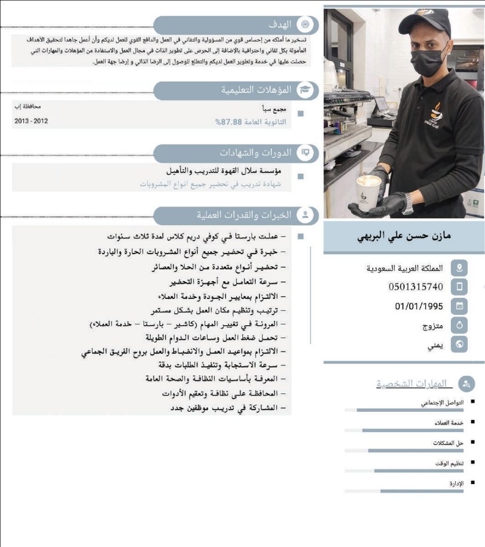 باريستا محترف خبرة ثلاث سنوات متواجد في الرياض أجيد مشروبات عصائر حلا سلطات فواكه شهادة صحيه موجود ومستعد للعمل ونقل الكفالة