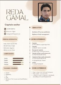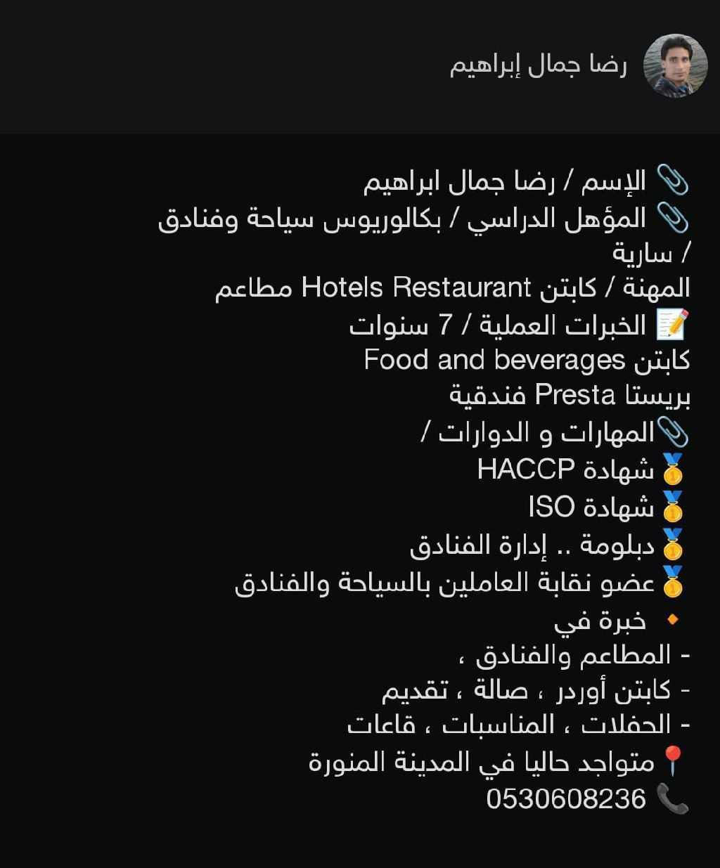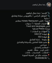 الاسم/ رضا جمال إبراهيم المؤهل الدراسي / بكالوريوس سياحة وفنادق / سارية المهنة / كابتن Hotels Restaurant مطاعم الخبرات العملية / 7 سنوات كابتن Food and beverages باريستا Presta فندقية المهارات والدوارات / شهادة HACCP شهادة ISO دبلومة. إدارة الفنادق عضو نقابة العاملين بالسياحة والفنادق خبرة في - المطاعم والفنادق، كابتن اوردر، صالة، تقديم - الحفلات