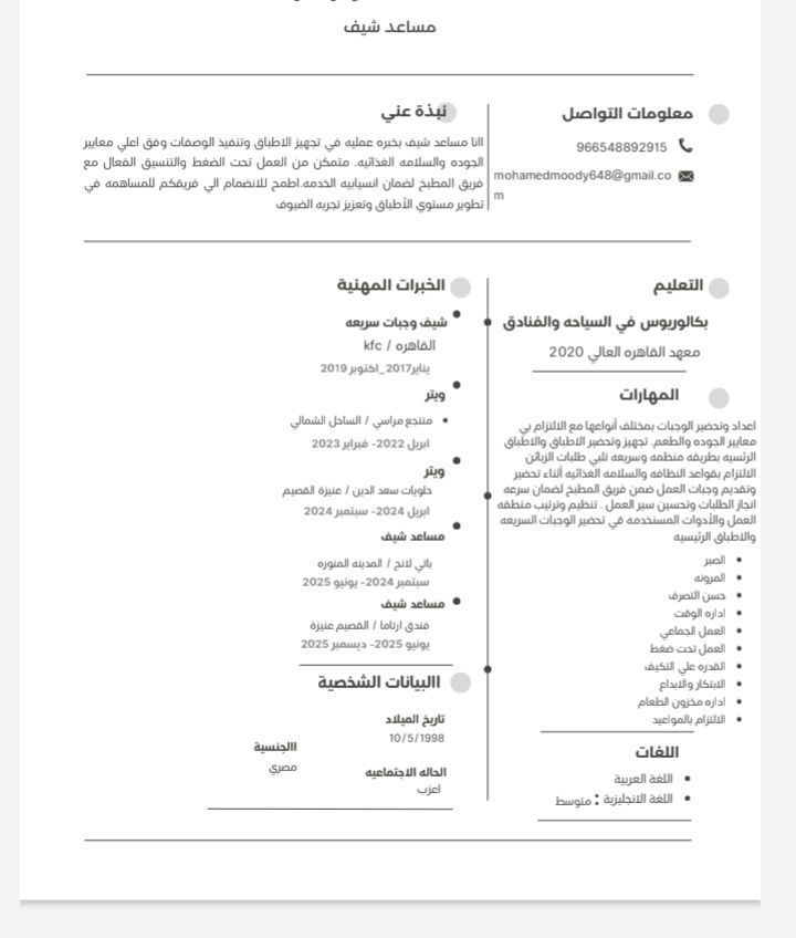 مساعد شيف سخن خبرة في المطاعم الفاست فود والباستا والبوفيهات والجريل والأطباق السخن المتنوعه