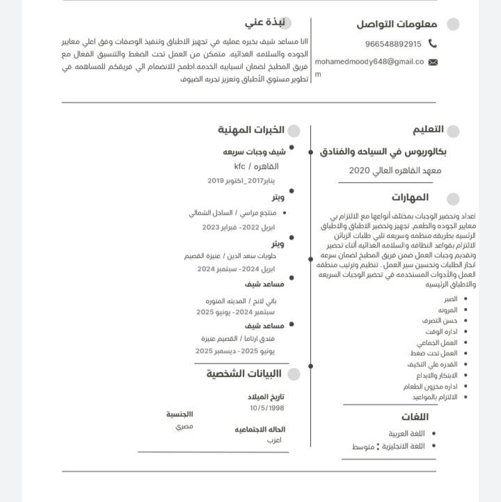 مساعد شيف سخن خبرة في المطاعم الفاست فود والباستا والبوفيهات والجريل والأطباق السخن المتنوعه والساندوتشات والحلا الغربي بأنواع مختلفه
