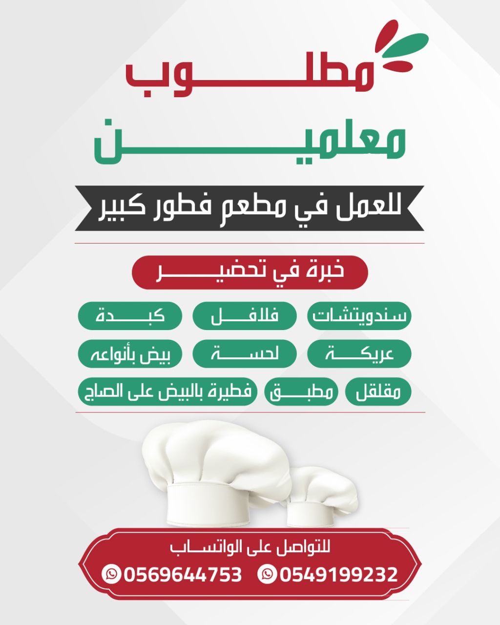 مطلوب 2 معلمين للعمل في مطعم فطور كبير سندويشات افطار مثل (فلافل، كبدة، بيض بأنواعه) مطبق، معصوب، عريكة، فطير بالبيض على الصاج الموقع المدينة المنورة، حي القبلتين