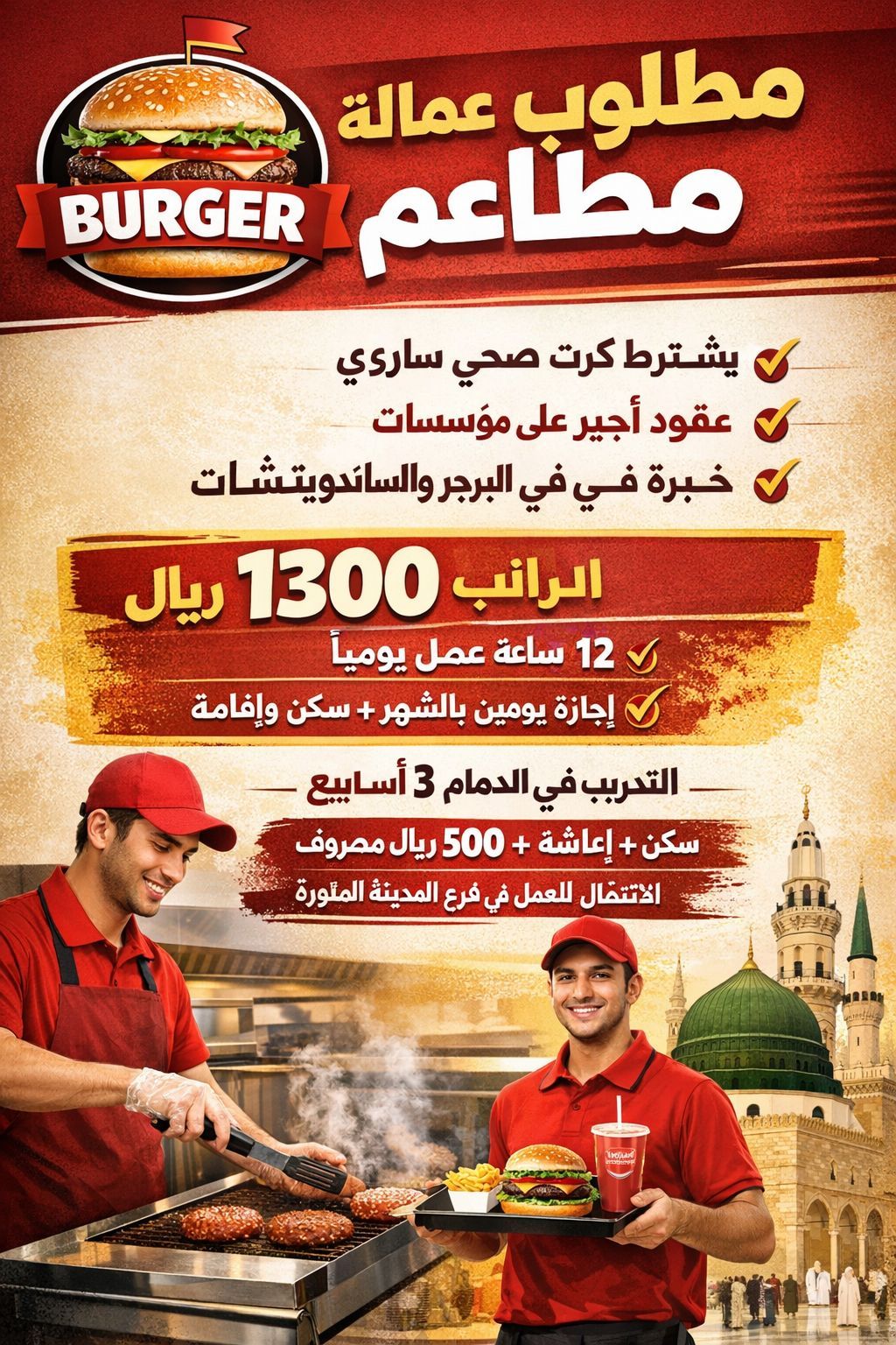 Job Vacancy - Burger Restaurant Location Madinah - Qurban District Requirements Valid health card Eligible for Ajeer contract Previous experience in burgers and sandwiches preferred Job Details Salary 1300 SAR Working hours 12 hours per day Days off 2 days per month Accommodation and residency fees provided by the company Training Period 3 weeks in Dammam Accommodation, meal
