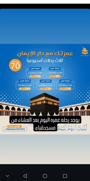 يوجد رحلات عمره 4 رحلات أسبوعيا من المدينة المنورة مسجد قباء بعد صلاه العشاء 70 ريال ذهاب وعودة للفرد للتواصل والحجز ويوجد حجز عمره بالفندق 80 ريال بالفندق غرفة رباعي للحجز