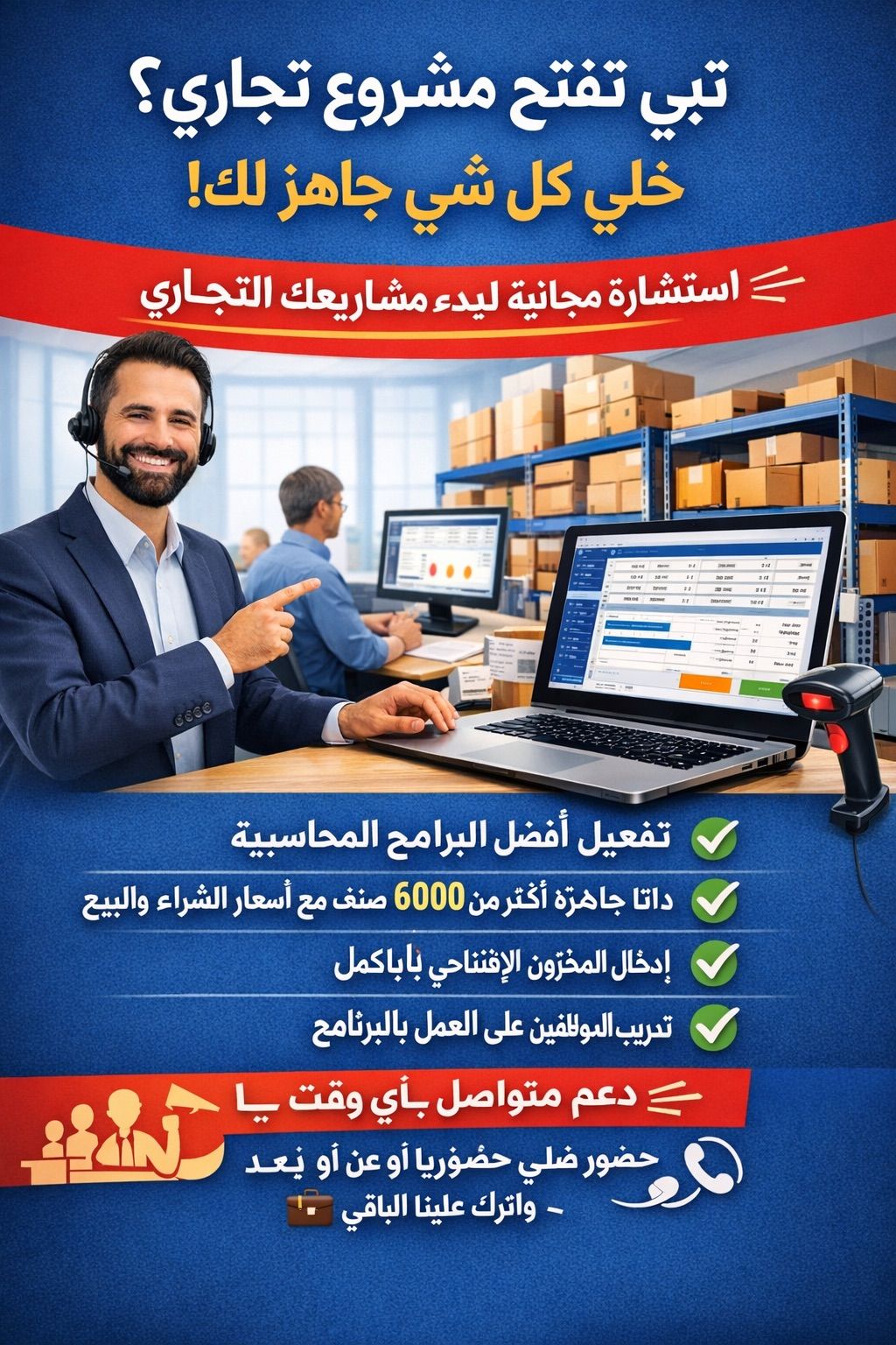 استشارة مجانية لبدء مشروعك التجاري ونوفر لك كل ما تحتاجه للتشغيل باحترافية تفعيل أفضل البرامج المحاسبية - داتا جاهزة لأكثر من 6000 صنف مع أسعار الشراء والبيع - ادخال المخزون الافتتاحي كامل - تدريب موظفيك على العمل بالبرنامج - دعم ومساعدة في أي وقت (حضور فعلي أو عن بعد) ابدأ مشروعك بثقة واترك علينا الباقي
