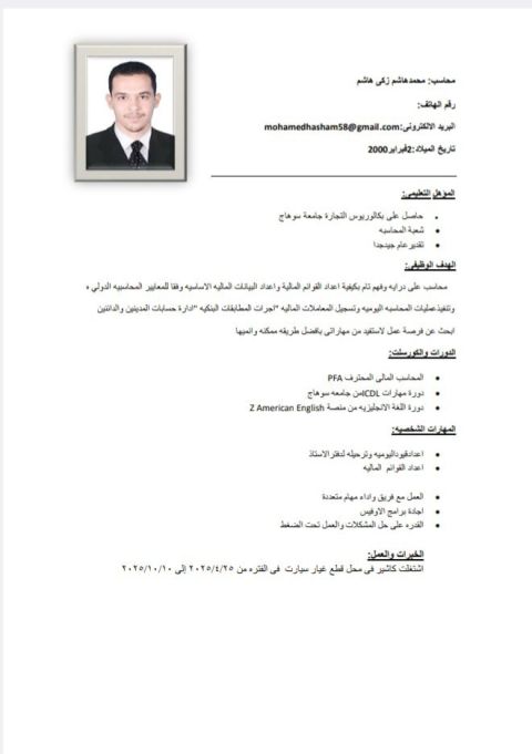 محاسب مالي بخبرة عامين يبحث عن فرصة عمل، خبرة قوية في حسابات العملاء ومتابعة التحصيلات لضمان تحسين السيولة المالية، اعداد القيود اليومية والتسويات البنكية بدقة واحترافية، واعداد التقارير المالية الشهرية والسنوية وتحليل البيانات المالية لدعم اتخاذ القرار، وإدارة المخازن والمخزون ومتابعة حركته بدقة اجادة برامج الأوفيس (word - Excel - PowerPoint) والبرامج المحاسبية ERP مهارات تنظمية قوية وقدرة علي العمل