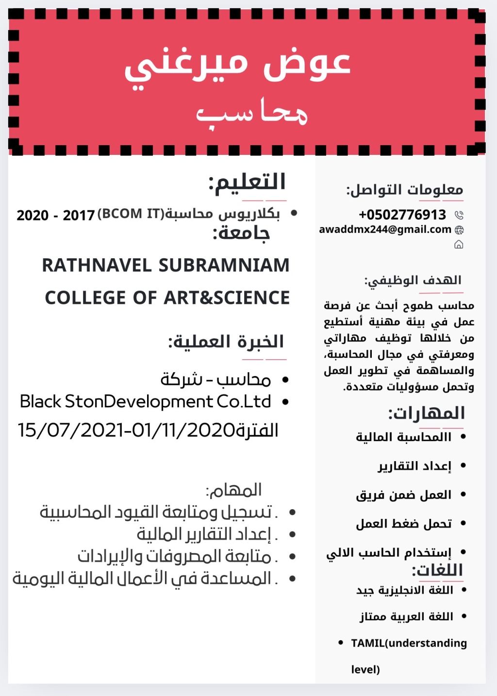 محاسب سوداني خريج الهند متفرغ جاهز للعمل إقامة سارية قابلة للنقل، ولدي الخبرة الكافيه للعمل في البرامج المحاسبية وexcel وعملته فترة وجيزة في مجال اللوجستيك وأجيد اللغة الانجليزية