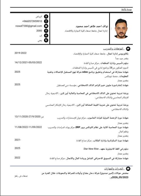 مدير مالي سوداني بكالوريوس امتياز في المحاسبة المالية. خبرة 12 سنة في السعودية. خبرة في اعداد القوائم والتقارير المالية والتحليل المالي في (التصنيع، المقاولات، الأغذية) اجادة اللغة الانجليزية تحدثا وكتابة. تعامل مع برنامج ERP. إقامة محاسب قابلة للنقل