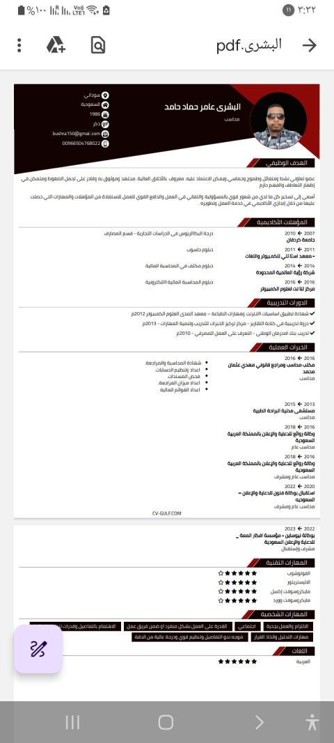 مدير حسابات سوداني الجنسية خبرة 20 سنة بالمملكة اجادة الحاسب الآلي والبرامج المحاسبية واعداد القوائم المالية والتحليل المالي واعداد ضريبة القيمة المضافة والتقارير الماليه والرقابة الماليه والتخطيط والتتطوير وادارة فريق العمل عملت على مختلف البرامج المحاسبية الأنشطة مطاعم، مقاولات، عقارات أنشطة تجاريه وخدمية ابحث عن عمل بدوام كامل