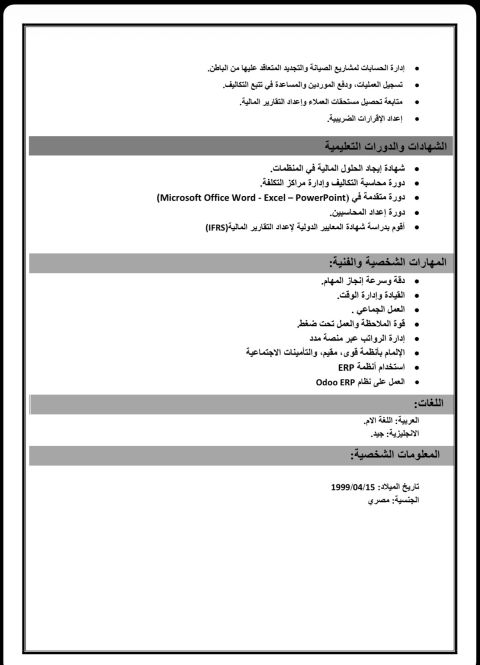 محاسب عام محترف، خبرة 5 سنوات في مجال المحاسبه عملاء موردين ومطابقه البنك والمخزون والاقرار الضريبي ومسيرات رواتب وتصفية عهد الموظفين ورفع كافة التقارير الماليه للادارة بشكل يومي خبرة في برنامج أودو والعمل علي الدورة المستندية كاملة والعمل علي الميزانية العموميه مع مكاتب المراجعة مصري الجنسية وإقامة سارية والعمل في شركة قابضة ومقرها الرياض والعمل في امساك حسابات مجمع طبي في الرياض ومتابعه كل ما يخصه