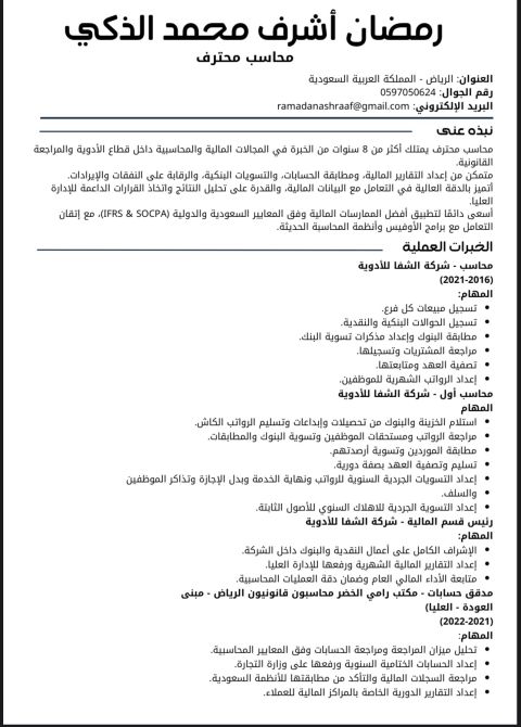 ابحث عن عمل خبرة بالمحاسبة لمدة 7 سنوات العمل على برنامج حسابات سمارت المحاسبي والعمل محاسب بفندق بالمملكة لمدة 3 سنوات والعمل على اليومية الأمريكية وميزان المراجعة وقائمة الدخل والضرائب وعمل اقرار ضريبة القيمة المضافة 15% وضريبة الإيواء للفنادق