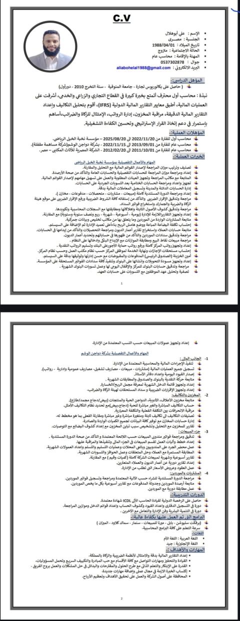 Sudanese Accountant - Fellowship Holder - 14 + Years of Experience Over 14 years of experience, including 10 years in auditing and 4 years as Head of Accounts. Experienced in managing accounts and taxation, with strong skills in recording entries, closing periods, and preparing reports and financial statements. Expert in tax and Zakat returns, data matching, and compliance requirements. Skilled in