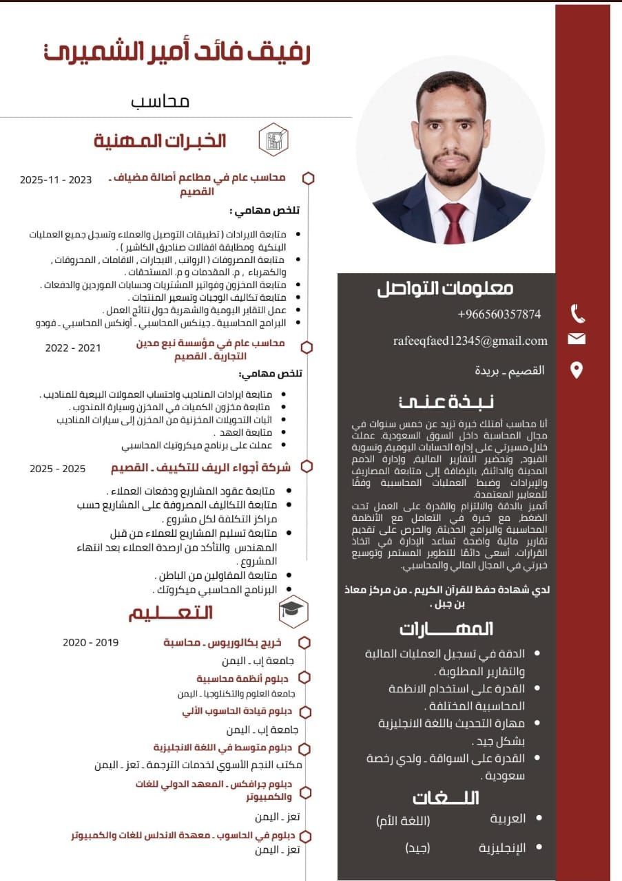 محاسب خبرة خمس سنوات في السوق السعودي على معرفة تامة بجميع الأعمال المحاسبية خبرة في الامور الضريبية والزكوية خبرة في حسابات المطاعم والمراكز التجارية خبرة في حسابات المقاولات