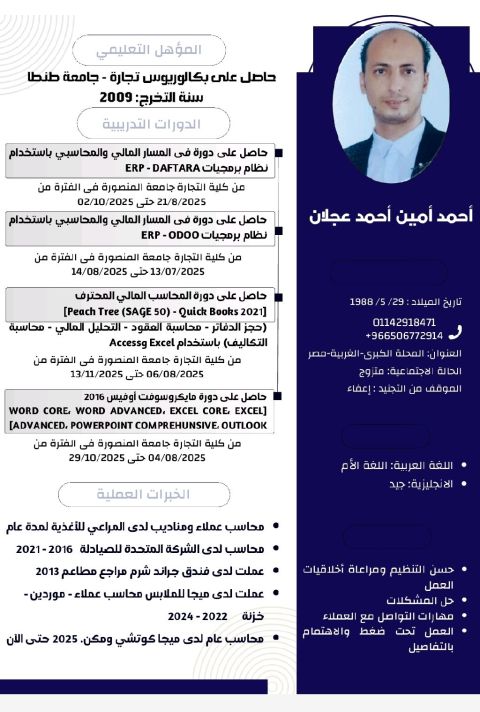 An Egyptian accountant with 16 years of experience in the field of accounting, available to start work immediately, with strong knowledge of Financial accounting General ledger and accounts Preparation of financial reports Working with accounting systems Closing accounts and monitoring expenses and revenues Known for accuracy, commitment, and ability to work under pressure
