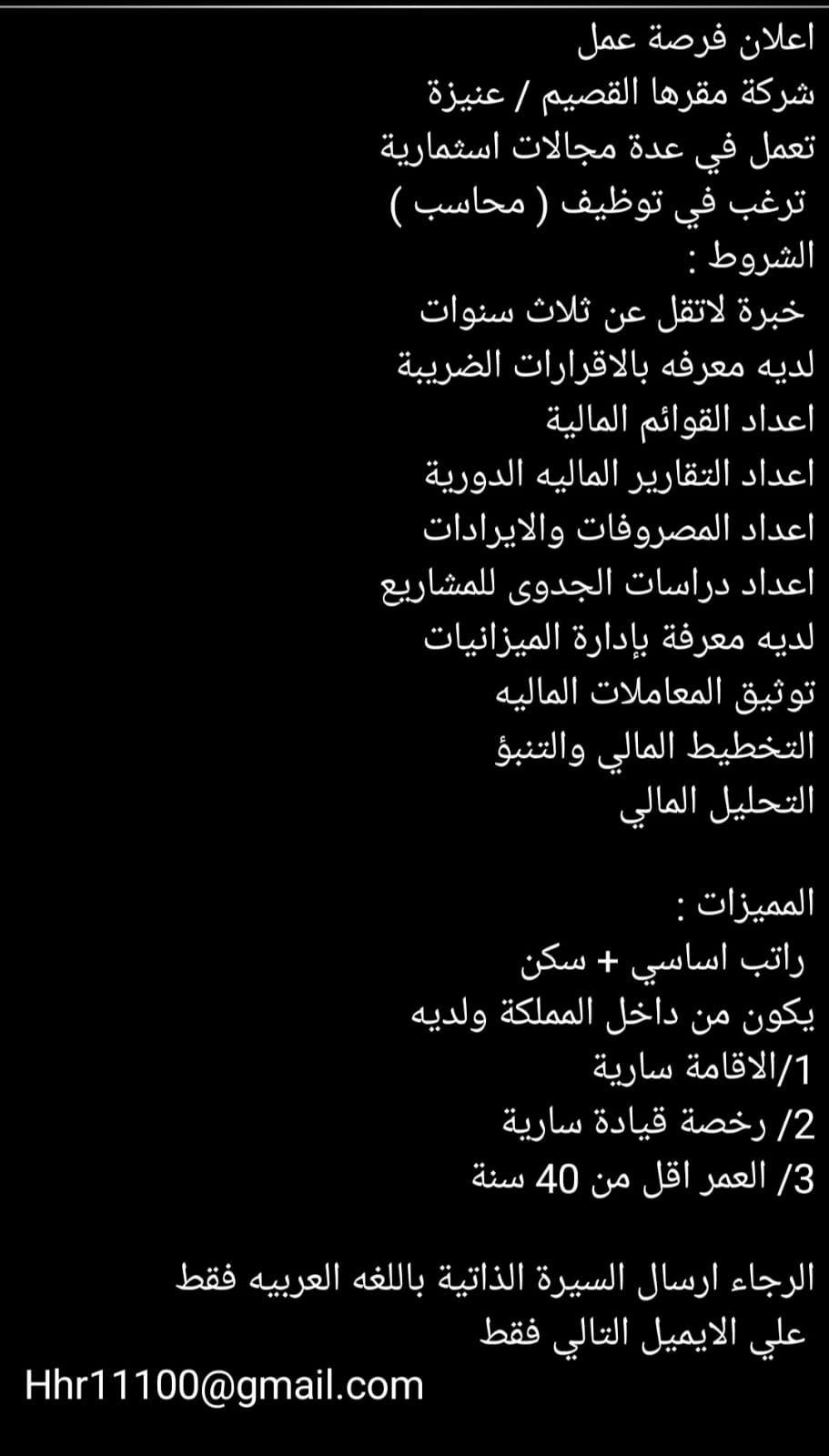 فرصة عمل - محاسب شركة استثمارية مقرها مدينة عنيزة - حي الفاخرية - طريق عمر بن الخطاب بجوار كافية دبل سلاش تعلن عن رغبتها في توظيف محاسب. الشروط خبرة لا تقل عن 3 سنوات - معرفة بالاقرارات الضريبية - اعداد القوائم والتقارير المالية الدورية - اعداد الايرادات والمصروفات - اعداد دراسات جدوى للمشروعات - إدارة الميزانيات والتخطيط المالي - توثيق المعاملات والتحليل المالي المتطلبات إقامة سارية داخل المملكة رجاء